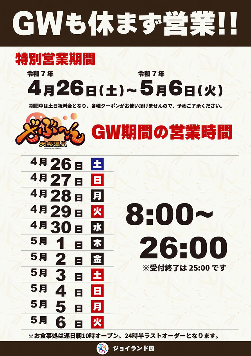 トップページ > 過去のお知らせ > GW特別営業期間のお知らせ