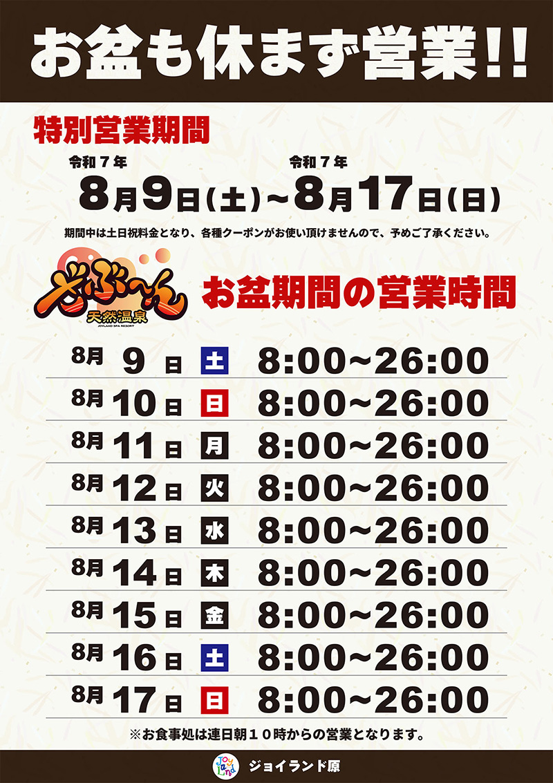 ※お食事処は通常通り10:00からの営業となります。※期間中の各種クーポン券のご利用は出来ませんので、予めご了承下さい。※期間中も回数券のご利用は可能です。