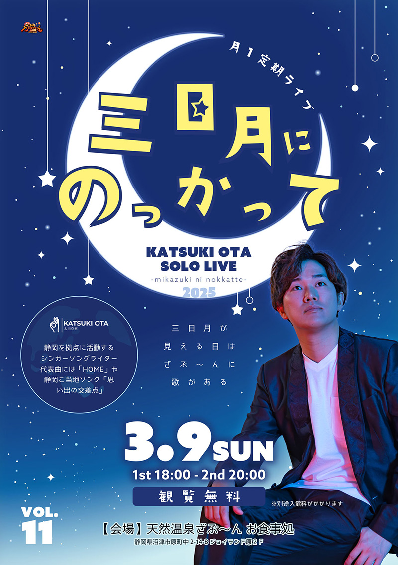 トップページ > 過去のお知らせ > 4月6日(日)開催 太田克樹ソロLIVE「三日月にのっかって」